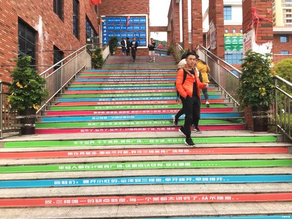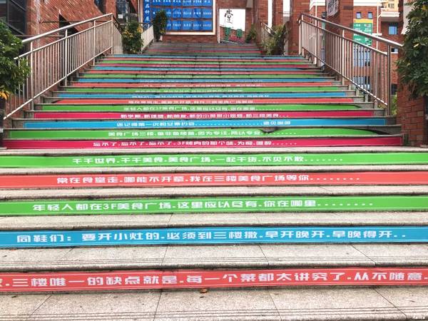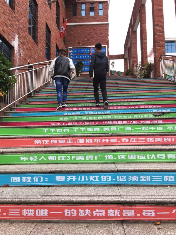 “我最喜欢‘一分钱,一分货,稀饭不顶饿’那句”。大一新生李同学说,第二食堂三楼餐厅是9月1日开业的,当天大家看到彩虹阶梯时,笑了好久,因为当时是第一次看到如此有创意的阶梯,不仅色彩鲜艳,内容更加接地气,比起之前光秃秃的阶梯,他们更喜欢现在的彩虹阶梯。