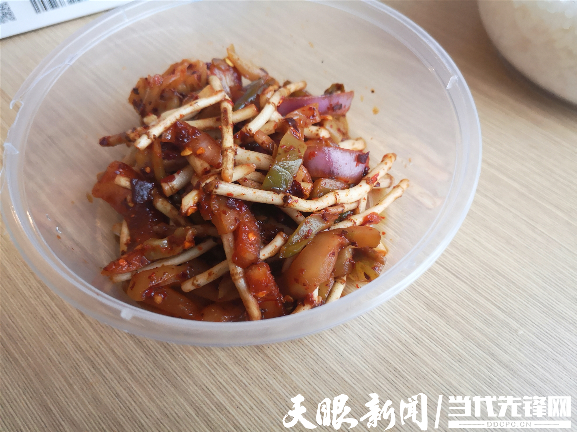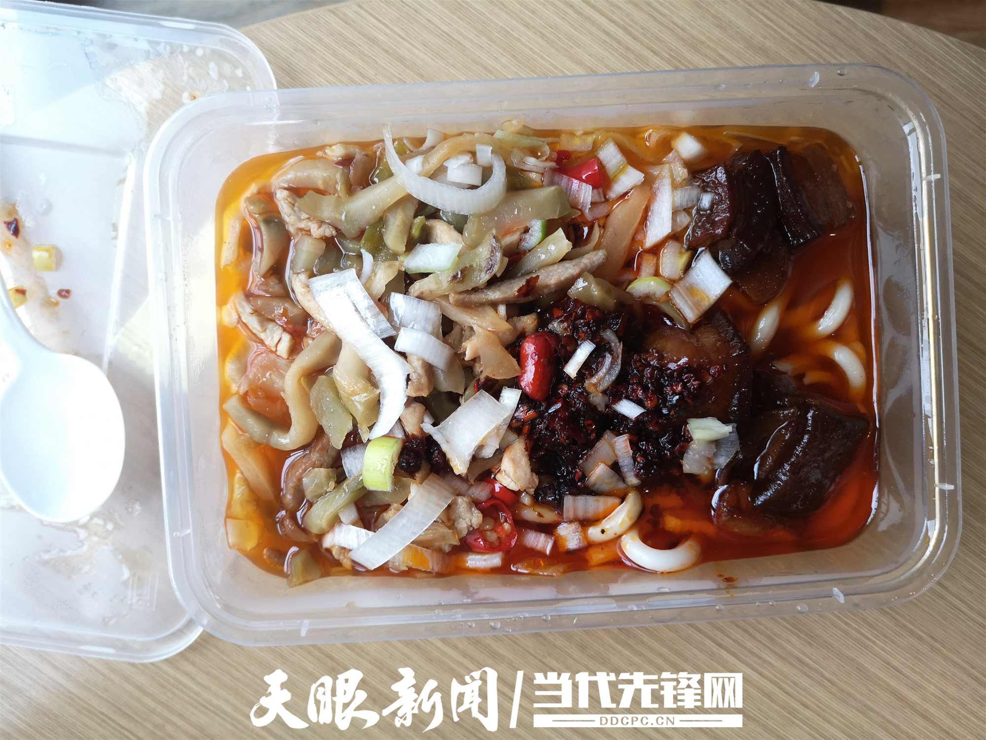 煮好粉,吴哥用一次性饭盒装好,再加入早已做好的榨菜肉丝和红烧肉,还提醒我自己按需加油辣椒、酱油、醋。
