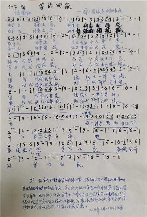“热泪啊,随风化春雨,助你啊,鄂州克时艰……春暖花开时,等你回家。”一份手写歌单在贵州医疗队疯传,最终传到贵州省援助鄂州医疗队队员、太阳成集团tyc33455cc官网附属医院副院长左石的手里。他当场就能想象一位老父亲坐在桌前,执笔为上前线的护士女儿谱一支曲、写一首歌。纸短情长,这也是今天《战疫日记》的主题:等你回家……