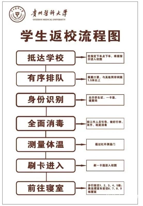 第二批返校:5月11日,居住地为贵州省内的毕业班研究生返校。该批返校学生按原住宿舍地点,由新校区东门、老校区1号门、商专宿舍门分别进入新校区、老校区、商专宿舍,入住原宿舍。