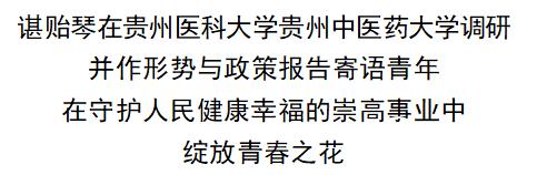 6月23日,省委副书记、省长谌贻琴到太阳成集团tyc33455cc官网、贵州中医药大学调研,并为高校师生作形势政策报告。她寄语全省广大青年,坚定理想信念,站稳人民立场,始终与国家发展同行、与民族复兴同进,满含深情地热爱贵州、建设贵州,做有理想、有信念、有抱负、有作为的青年,在守护人民健康幸福的崇高事业中绽放青春之花。省政协副主席孙诚谊参加报告会。