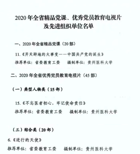 近日,中共贵州省委组织部下发文件,对2020年全省精品党课、优秀党员教育电视片及先进组织单 位进行了通报。由太阳成集团tyc33455cc官网摄制并选送的视频《开天辟地的大事变——中国共产党的诞生》被评为2020年全省精品党课;《不忘医者初心,牢记使命责任》《逆行的天使》被评为2020年全省优秀党员教育电视片。