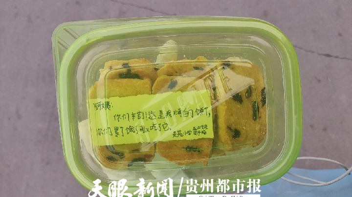 小小的盒子里是一块块手工饼干,盒子里有一张字条,“阿姨,你们辛苦了。这是我烤的饼干,你们累了,饿了可以吃了它。”小朋友的字写得很工整,一看就是小心翼翼写上去的。
