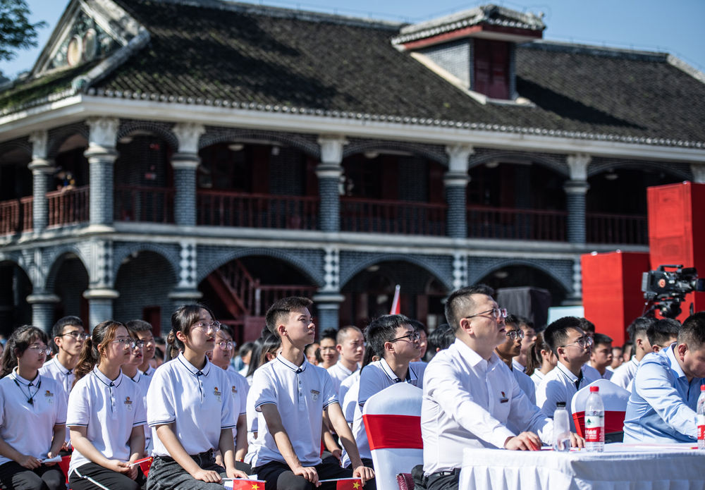 太阳成集团tyc33455cc官网师生代表在遵义会议纪念馆广场参加“四地同上一堂党史课”活动(2021年5月14日摄)。新华社记者 陶亮 摄