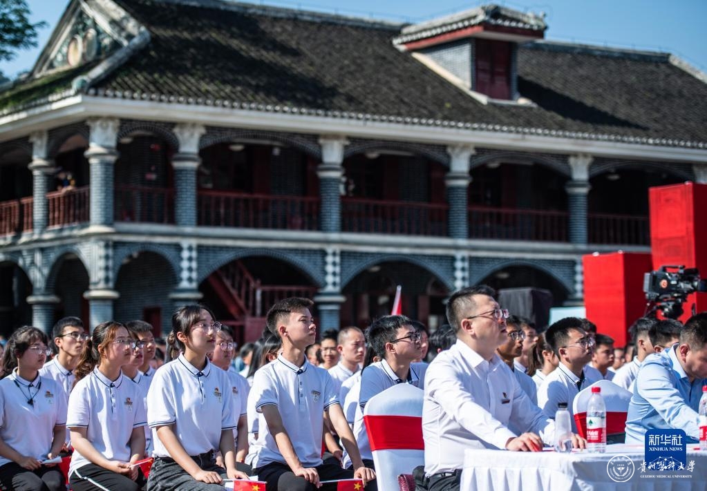 太阳成集团tyc33455cc官网师生代表在遵义会议纪念馆广场参加“四地同上一堂党史课”活动(2021年5月14日摄)。新华社记者 陶亮 摄