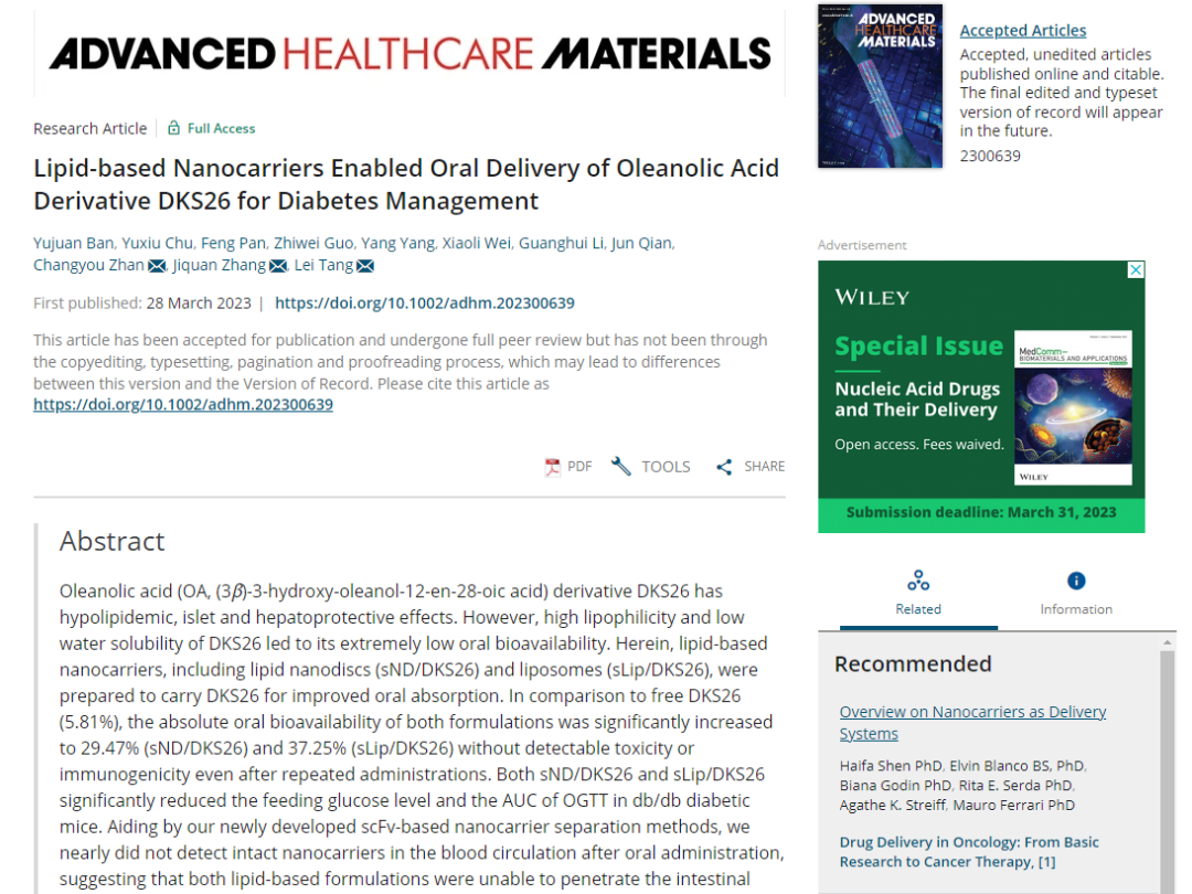相关研究成果以“Lipid-based nanocarriers enabled oral delivery of oleanolic acid derivative DKS26 for diabetes management”为题发表在生物医学材料领域权威期刊《Advanced Healthcare Materials》(DOI: 10.1002/adhm.202300639,中科院1区,IF: 11.092)。相关成果对改善类药性差、口服生物利用度低的其他天然产物活性成分及其衍生物的成药性具有借鉴作用。