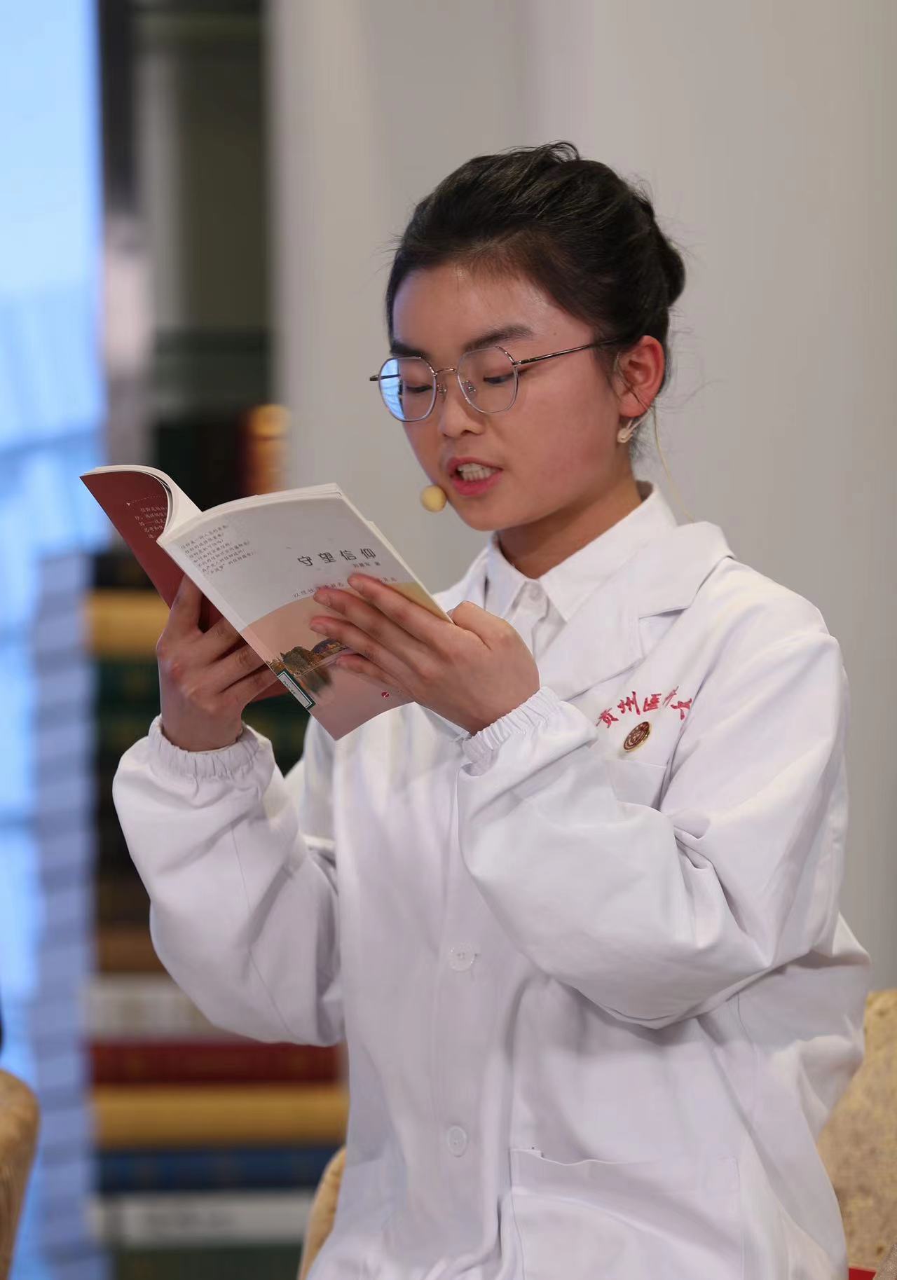 周润同学说对她影响巨大的一句话,是她的老师李红梅勉励她的那句“大学的教育一定是要见森林”。在学习的过程中,她感觉到医学里面包含着自然科学,也有人文科学和社会科学。所以,在校园求学的同时,周润也经常动手写点东西,提高自己的人文素养。周润还为世界读书日专门创作了一首小词,在节目现场跟大家分享。