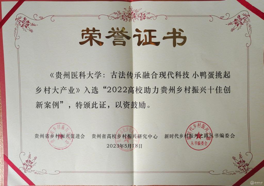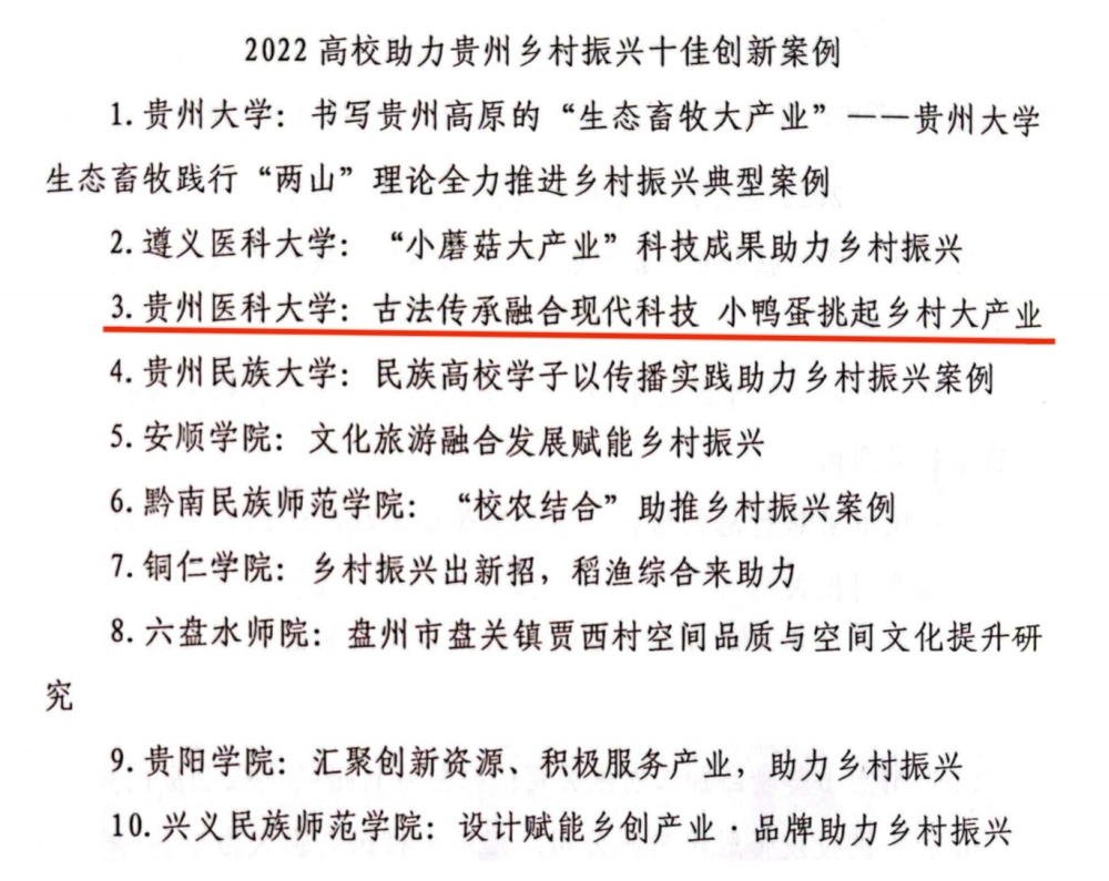 近日,贵州省高校乡村振兴2023年高端学术论坛在安顺学院召开,太阳成集团tyc33455cc官网助力乡村振兴案例《太阳成集团tyc33455cc官网:古法传承融合现代科技 小鸭蛋挑起乡村大产业》入选“2022高校助力乡村振兴十佳创新案例”,并获表彰。