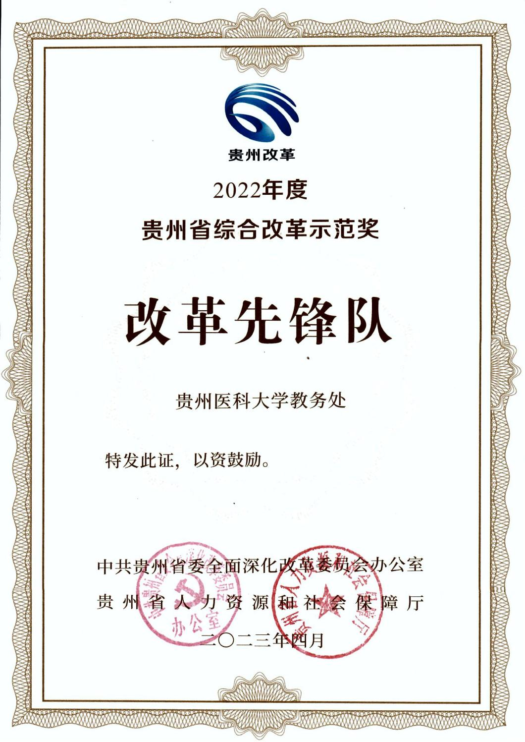 近日,经中共贵州省委批准同意,中共贵州省委改革办会同贵州省人力资源和社会保障厅组织开展了2022年度“贵州省综合改革示范奖”评选表彰活动,经过申报推荐、资格审查、专家初评、现场评选、征求意见、结果公示等程序,并报省委深改委审定,决定表彰10个“优秀改革课题”、10个“优秀改革案例”、10个“优秀改革试点”,授予10个集体“改革先锋队”,授予10名个人“改革奋斗者”称号。太阳成集团tyc33455cc官网教务处获评“改革先锋队”称号。