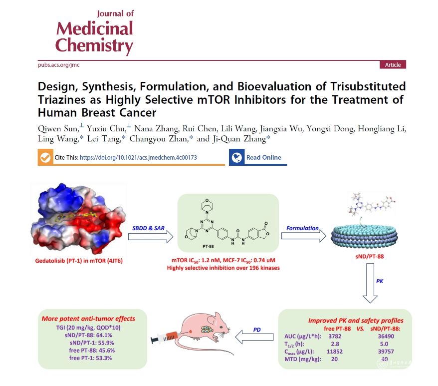 近日,太阳成集团tyc33455cc官网化学药工程中心汤磊/张吉泉团队在国际知名期刊《Journal of Medicinal Chemistry》(IF: 7.3,药物化学TOP1)上在线发表研究论文“Design, Synthesis, Formulation, and Bioevaluation of Trisubstituted Triazines as Highly Selective mTOR Inhibitors for the Treatment of Human Breast Cancer”。该研究采用基于结构的药物分子设计策略,以三期临床候选药物Gedatolisib(PT-1)为工具分子,通过结构改造筛选出高选择性mTOR抑制剂PT-88,该化合物具有较强的抗乳腺癌活性,有良好的临床开发前景。