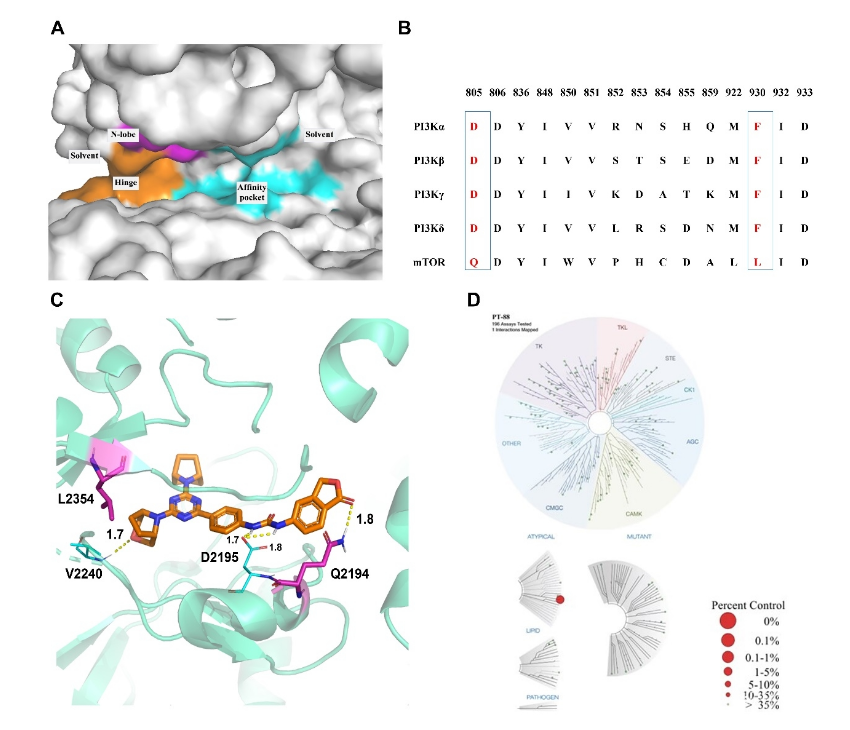 汤磊/张吉泉团队近年的主要研究方向之一是围绕恶性肿瘤及其发病机制,基于PI3K-Akt-mTOR信号通路开展创新药物研究,取得了系列创新性成果(J. Med. Chem.,2016, 59, 7268-7274;Eur. J. Med. Chem.,2020, 204, 112637;Eur. J. Med. Chem.,2022,229, 114055;Bioorg. Chem.,2023, 140, 106781;Eur. J. Med. Chem.,2023,260 115754.)。近期,该团队以泛PI3K/mTOR抑制剂PT-1作为工具分子,根据PI3Ks及mTOR蛋白序列上关键残基的不同,开展理性药物分子设计,经过两轮构效关系研究最终发现了高活性mTOR抑制剂PT-88(IC50:1.2 nM)。激酶谱测试显示(196种激酶),PT-88专一性地结合mTOR,显示出极高的选择性。研究进一步通过分子动力学(MD)、关键残基自由能分解及丙氨酸扫描突变等技术对PT-88的分子结合模式进行了分析。