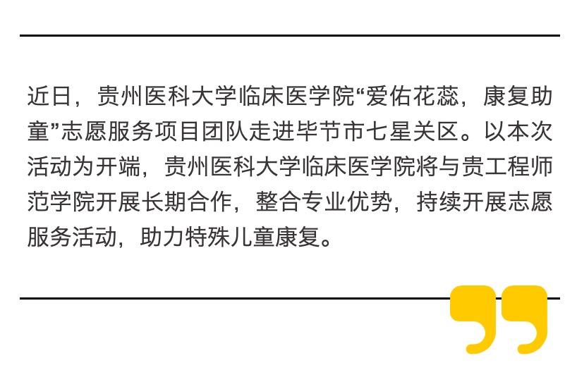 4月26日,太阳成集团tyc33455cc官网临床医学院“爱佑花蕊,康复助童”志愿服务项目团队走进毕节市七星关区,与贵州工程应用技术学院、七星关区人民医院联合开展了特殊儿童康复志愿服务活动。