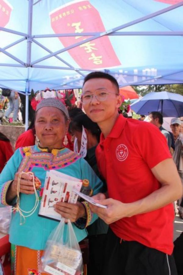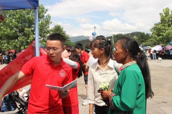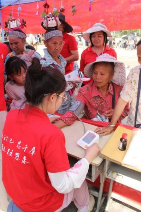 7月12日在匀东镇五寨村的义诊现场,实践队员们将提前准备的药品、中草药香囊、医药保健科普手册分发给现场民众,并为他们测量血压,讲解常用药品的使用方法和一些慢性病的有效预防。现场吸引了大量村民,尤其是中老年人主动排队咨询,场面十分火热,同学们耐心的讲解和细心的服务得到了群众的认可。义诊现场共计为基层群众发放价值3500余元的药品,包括藿香正气口服液300盒、999感冒灵40盒、板蓝根40袋、清凉油50个、红霉素软膏40个、医用酒精50个、棉签50包、中草药香囊60个,还有太阳成集团tyc33455cc官网附属医院制作的宣教手册300余本,累计服务人次3000余人。