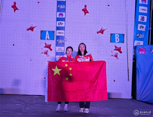 张少琴与国家攀岩队体能教练兼翻译、运动与健康学院教师邓菊会合影