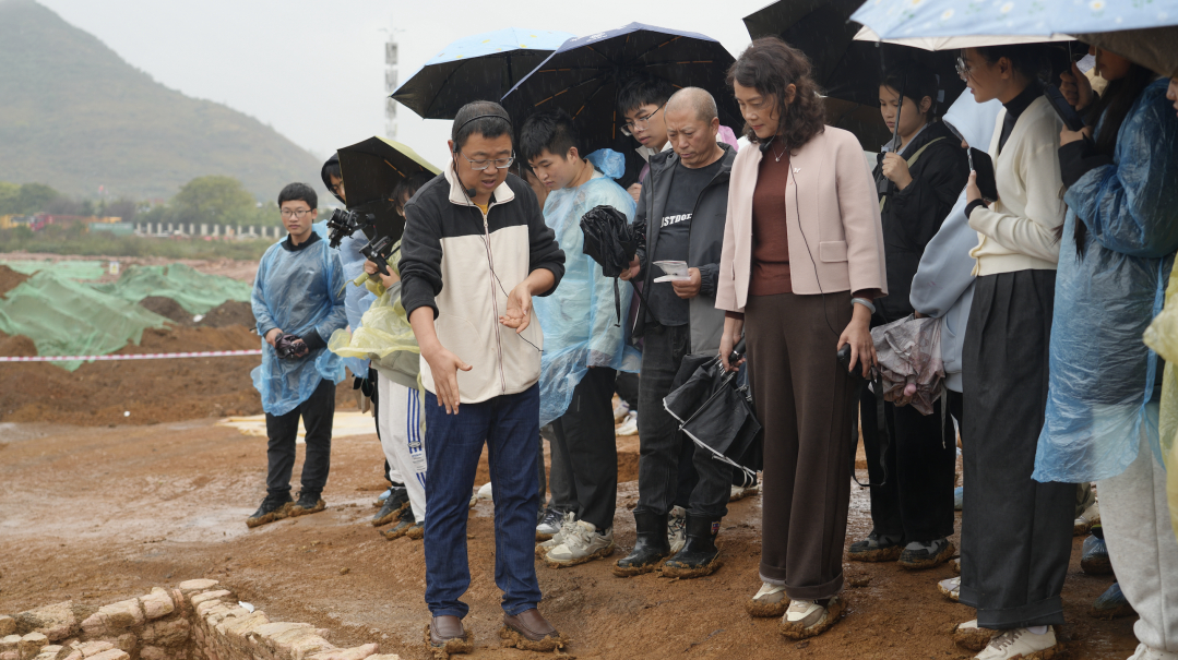 在考古工作人员带领下,同学们深入坡坡顶墓群发掘现场,近距离参观墓葬的考古发掘。“大松山墓葬群年代从两晋南北朝延续到明清时期,时间跨度很大并没有中断,是一部埋葬于地下的黔中通史。”胡昌国介绍,大松山墓葬群发掘工作于2022年7月展开,由贵州省文物考古研究所联合北京大学、四川大学、中山大学对该墓群开展全面考古发掘,2023年1月结束。截至目前,共发掘面积13500平方米,清理墓葬2192座,出土各类文物4000余件(套)。