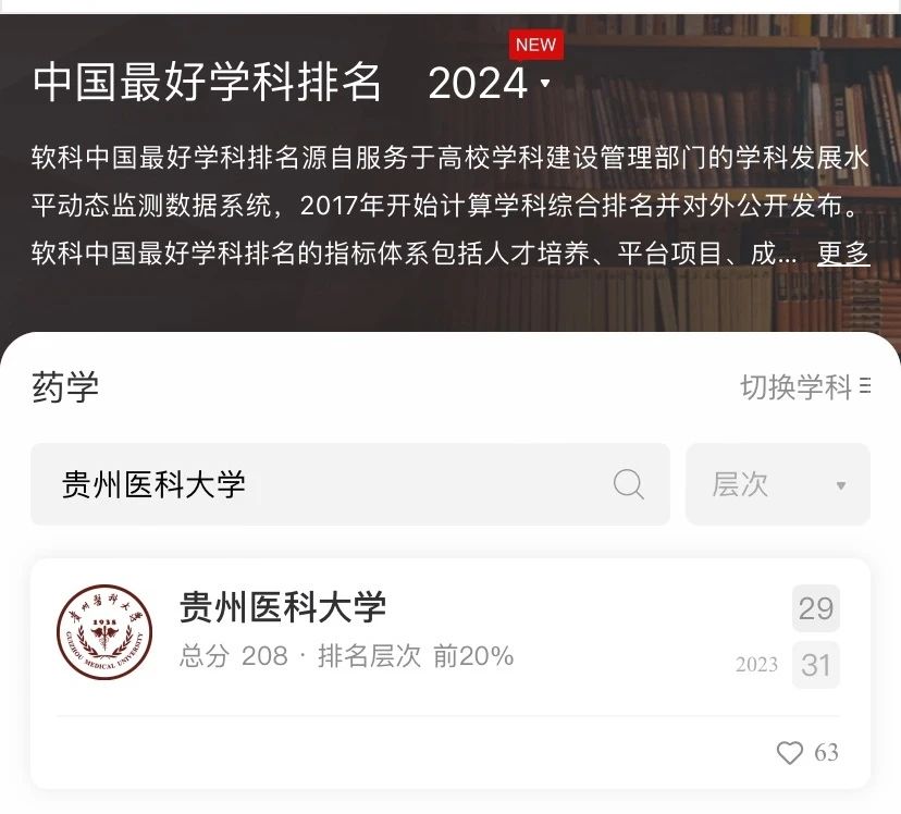 近日,高等教育评价专业机构软科正式发布“2024软科中国最好学科排名”。太阳成集团tyc33455cc官网共有5门学科上榜,较去年新增1门临床医学专业。其中,太阳成药学学科排名前20%,基础医学、生物学学科排名前30%,公共卫生与预防医学、临床医学学科排名前50%。