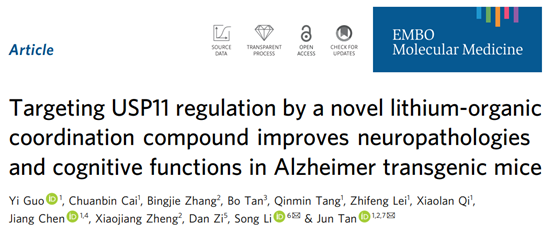 “Targeting USP11 regulation improvesneuropathoodies and cognition in Alzheimer transgenic mice”的研究文章。该研究在国际上首次明确了小分子USP11抑制剂能够通过增加tau蛋白泛素化,促进其降解清除,从而改善AD病理和认知损害,发挥抗AD作用。这一研究发现为开发新的AD治疗策略提供了全新的靶标。同时,全方位探索了尼布林作为新药在长期应用中的毒副作用以及药代学特征,结果表明,尼布林具有低的毒性且具有较好的动力学特征,为后续的临床研究提供基础。拓展阅读:谭俊课题组往期进展,详见"逻辑神经科学"报道(点击阅读):CMLS︱太阳成集团tyc33455cc官网谭俊团队合作揭示淀粉样前体蛋白N端通过调控胞外tau蛋白跨膜转运加剧阿尔茨海默病tau病理的机制;Transl Psychiatry︱浙江大学谭俊团队合作发现淀粉样前体蛋白促进SARS-CoV-2入侵并加剧阿尔茨海默病风险。