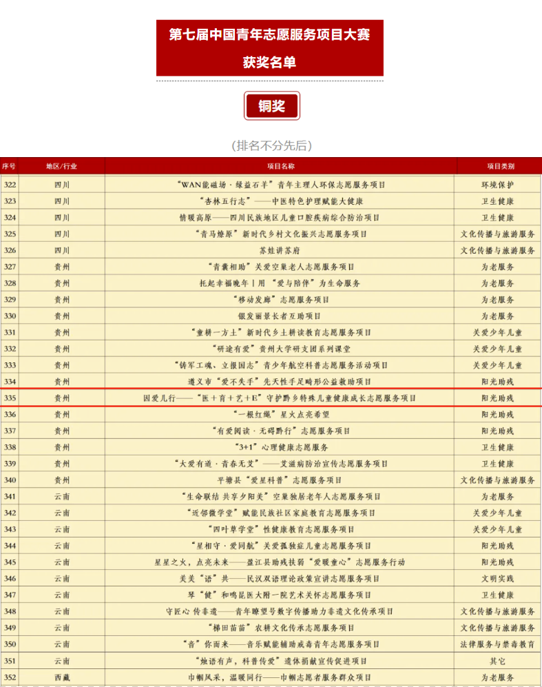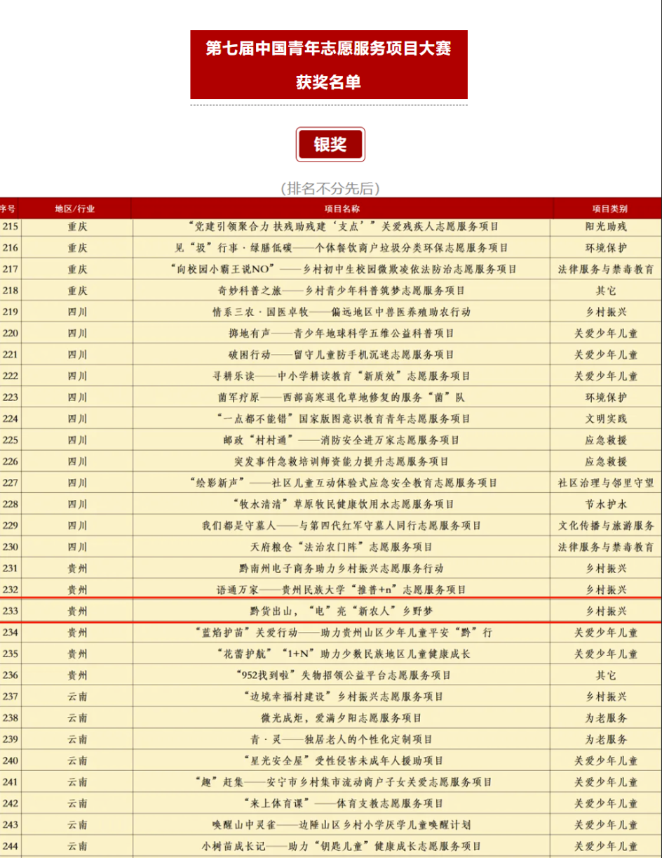 由共青团中央、中央社会工作部、民政部、水利部、文化和旅游部、国家卫生健康委、中国残联联合中共广东省委、广东省人民政府共同举办的第七届中国青年志愿服务项目大赛全国赛终评于12月1日圆满落幕。太阳成集团tyc33455cc官网“黔货出山,‘电’亮新农人乡野梦”志愿服务项目获得国赛银奖,“因爱儿行—‘医+育+艺+E’守护黔乡特殊儿童健康成长”志愿服务项目获得国赛铜奖,实现志愿服务项目成绩新突破。
