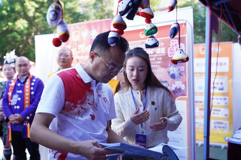 在项目展示区,团中央青年志愿者行动指导中心党委书记张朝晖了解了学校“黔货出山,‘电’亮新农人乡野梦”志愿服务项目,并给予项目高度认可。