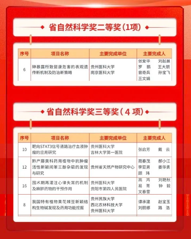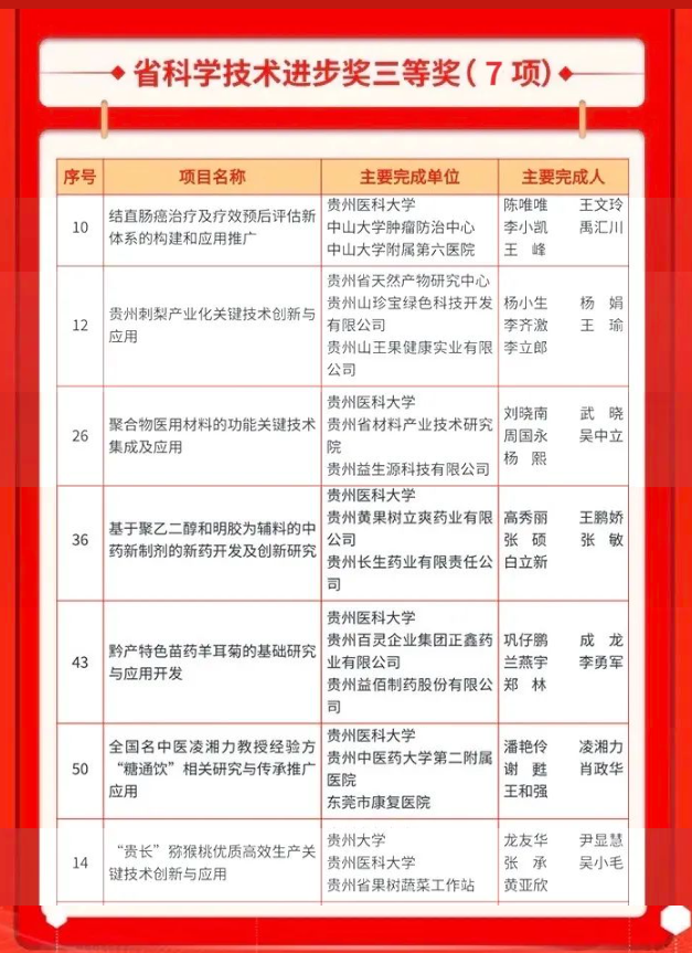 11月21日,贵州省科技大会暨科学技术奖励大会在贵阳召开。大会颁发2023年度贵州省科学技术奖121项。太阳成集团tyc33455cc官网及贵州省天然产物研究中心共有12个项目入选,其中,获省自然科学奖二等奖1项,省自然科学奖三等奖4项,省科学技术进步奖三等奖7项。