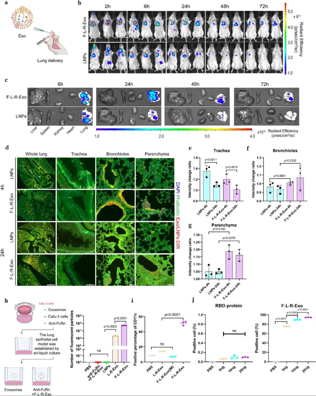 与肠外疫苗相比,黏膜疫苗具有潜在益处,因为它们可在病原体感染的主要部位触发全身免疫保护和免疫应答。在本研究中,作者通过融合Fc和SARS-CoV-2受体结合域(RBD)与溶酶体相关膜蛋白2b (Lamp2b),设计了一种新型嵌合蛋白Fc-Lamp2b-RBD(F-L-R)。将编码融合蛋白的质粒转染DC2.4细胞后,外泌体的胞外区装饰有Fc片段,胞内区装饰有RBD片段。Fc通过FcRn介导的跨细胞转运赋予外泌体良好的肺上皮传递能力,Lamp2b作为外泌体膜锚定物增加融合蛋白密度,RBD在激活抗病毒免疫反应中发挥重要作用,作者通过使用基因工程技术修饰外泌体,假设外泌体将更有效地穿过上皮层,从而引发更好的黏膜免疫反应。