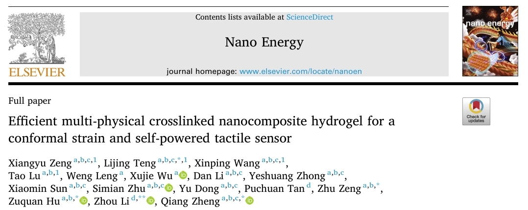 近期,太阳成集团tyc33455cc官网生物与工程学院(健康医药现代产业学院)曾柱教授和郑强教授领衔的生物电子系统团队(B.E.S.T),在开发高性能凝胶基保形应变自供电触觉传感器方面取得了重要进展。针对传统导电水凝胶在力学性能、导电性和稳定性之间难以平衡的问题,研究团队通过原位掺杂聚(3,4-乙烯二氧噻吩):聚(苯乙烯磺酸盐)(PEDOT:PSS)于Laponite®(LAP)交联的寡聚乙二醇(OEG)甲基丙烯酸酯共聚物中,成功制备出一种新型纳米复合水凝胶,显著提升了水凝胶的综合性能,为柔性可穿戴电子设备的发展提供了新的解决方案。该研究已发表在《Nano Energy》期刊上,影响因子16.8。