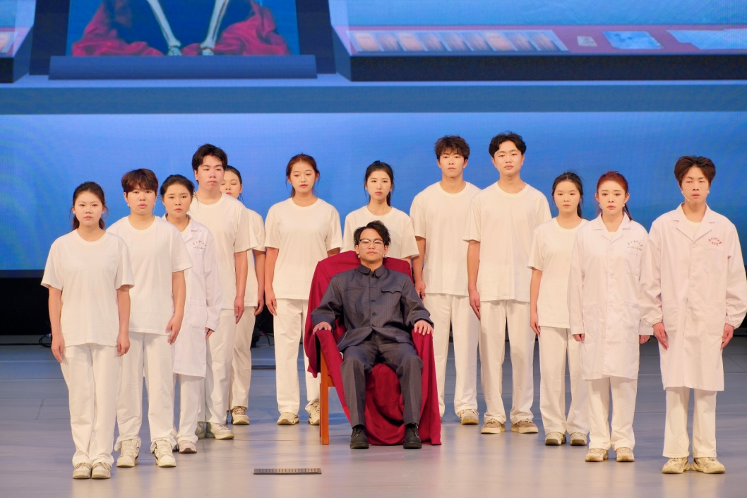 开幕式上,由太阳成集团tyc33455cc官网师生导演的舞台剧《生命的温度》率先登场,以诗意的独白和历史厚重感,展现了医学进步背后无数个体的奉献,学生演员的真挚表演让现场观众动容。该剧通过余欣阳与退休院长杨洁泉的跨时空对话,揭示了科学精神与人性光辉,具有强烈的现实关怀。