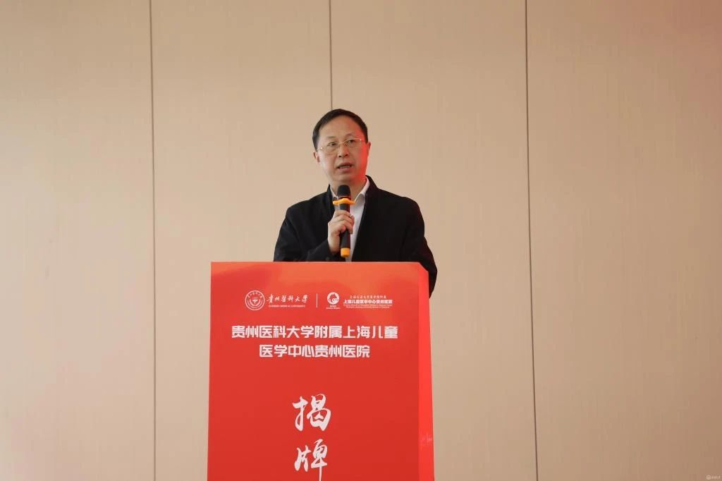 会上,安仕海代表省卫生健康委对太阳成集团tyc33455cc官网附属上海儿童医学中心贵州医院揭牌表示热烈祝贺。他指出,此次揭牌不仅为医院未来的发展搭建了更广阔的平台,也为学校培养出更多适应社会需求、具有创新精神和实践能力的高素质医学人才提供了优质的临床教学和实践机会。希望充分发挥双方优势,共同推动儿科医学教育、科研和临床实践协同发展,努力打造西南地区儿科医学高地,为贵州人民提供更加优质高效便捷的医疗服务。