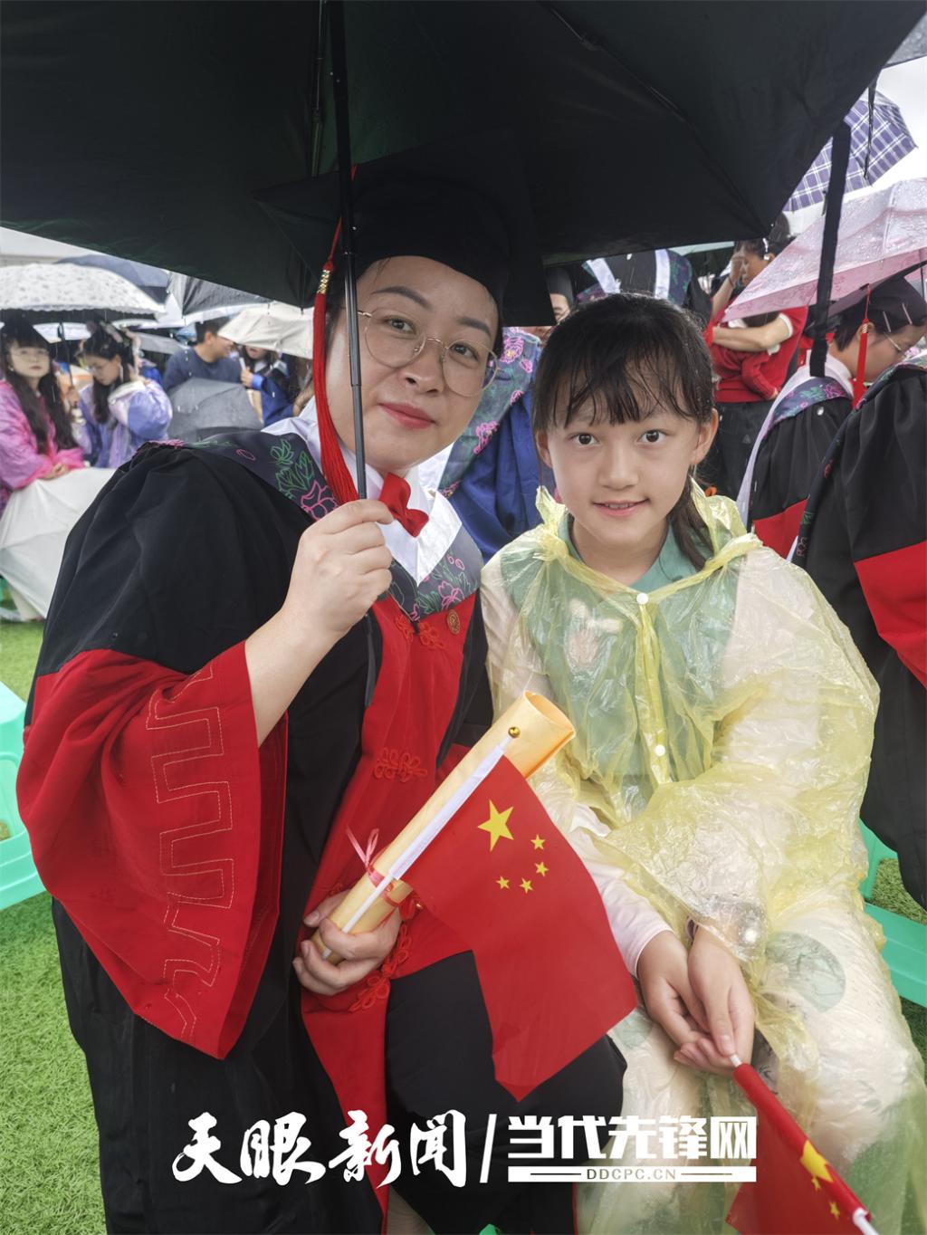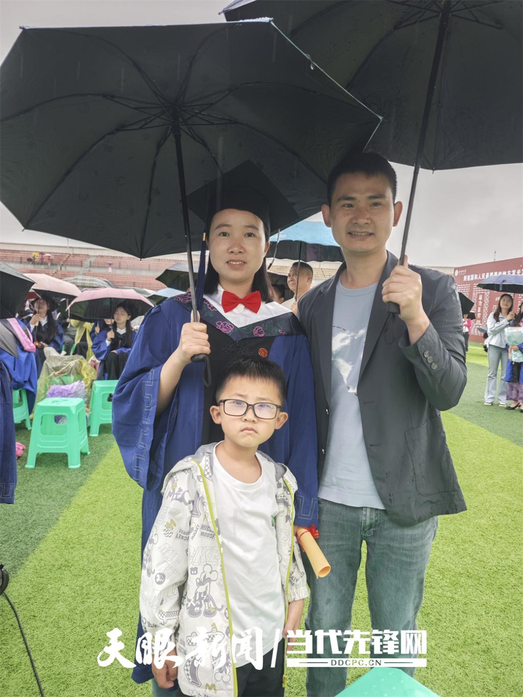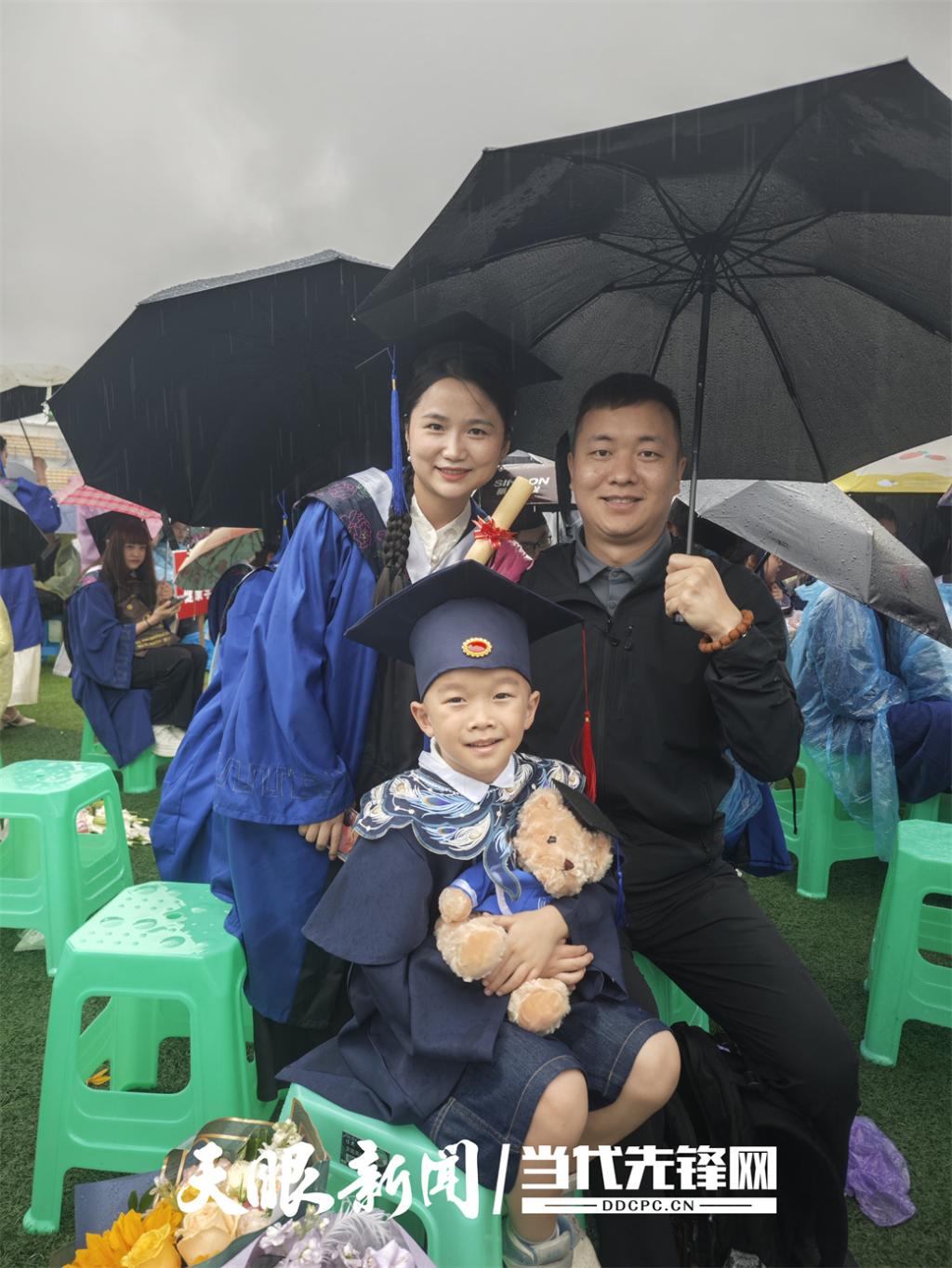 临床医学硕士朱骞一家三口参加典礼,感言:“雨幕做背景,家人是勋章,这硕士帽的分量,有你俩才完整。”