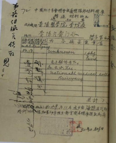 中国红十字会救护总队材料总库为国立贵阳医学院转运外科仪器通知单