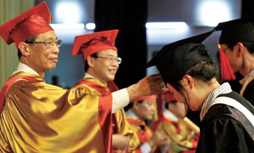 前天16时,贵阳医学院举行2014届毕业典礼暨钟南山奖学金颁奖仪式,约1200名老师及毕业生代表参加了此次活动。中国工程院院士、贵阳医学院名誉校长钟南山为毕业生拨穗并送上祝福。钟院士寄语说:“要保持对人生的追求,在自己的岗位上做出出色的成绩,就是对你们也是对我最大的肯定。”图为钟南山院士为毕业生拨穗。 据中新社