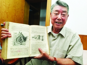 九十五岁高龄的刘伍生教授,向记者展示抗战时期曾经学习的英文课本。