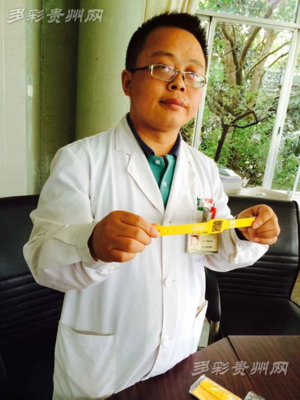 方旭明医师展示为老年痴呆患者制作的手带,上面有二维码,一扫就能知道老人的家中联系方式。