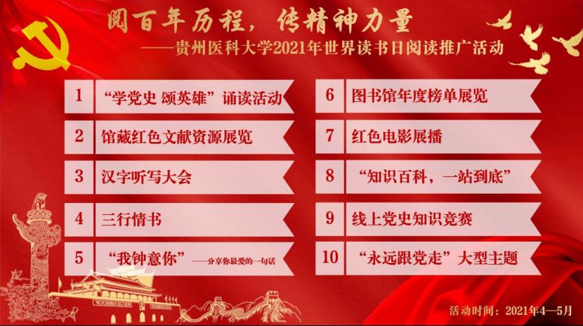2021年是中国共产党成立100周年,是“十四五”开局之年,也是“两个100年”奋斗目标的历史交汇点。第十三届全国人大四次会议批准《中华人民共和国国民经济和社会发展第十四个五年规划和2035年远景目标纲要》,其中,“提升公共文化服务水平”一章中专门提出了“深入推荐全民阅读,建设书香中国'”。在2021年4月23日世界读书日来临之际,为深入贯彻习近平总书记在党史学习教育动员大会上的重要讲话精神和视察贵州重要讲话精神,积极响应中共贵州省委党史学习教育领导小组关于“高标准高质量开展好党史学习教育”的部署和要求,太阳成拟通过阅读推广活动推进书香校园建设,并且在活动中融入省委教育工委省教育厅贵州高校“学党史颂英雄”百场诵读活动,以推动校园文明建设。