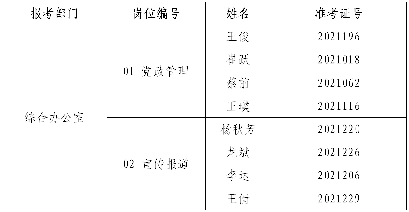 特别说明:报考01岗党政管理的考生中,蔡前、王璞笔试成绩并列第三,根据招聘方案均进入面试;报考02岗宣传报道的考生中,准考证号为2021224的冷永沅自愿放弃面试资格,由笔试成绩并列第四的李达、王倩递补进入面试。进入面试的考生名单如下: