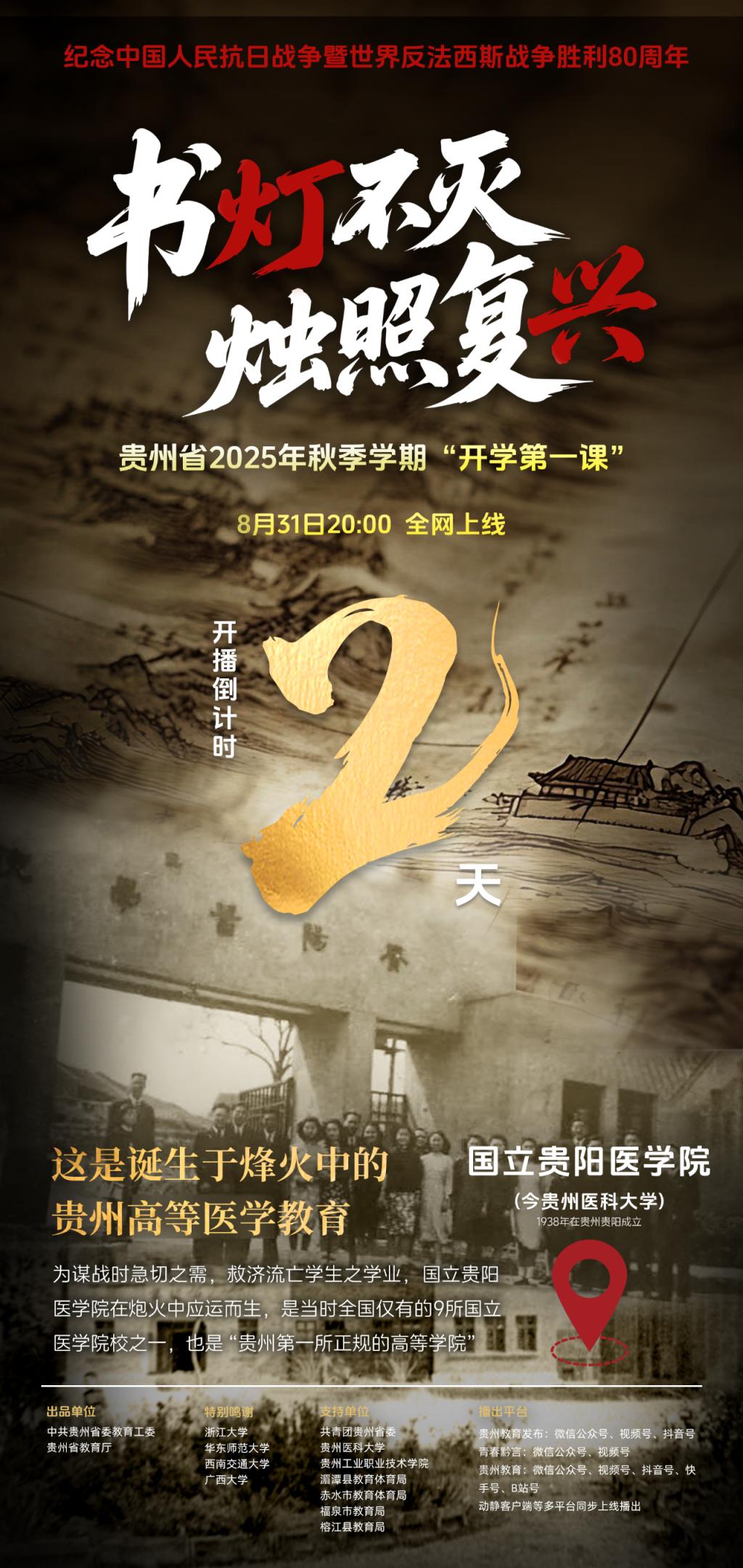 为深入学习贯彻习近平总书记关于在新时代继承和弘扬伟大抗战精神的重要指示精神,围绕中国人民抗日战争暨世界反法西斯战争胜利80周年重要时间节点,中共贵州省委教育工委、贵州省教育厅精心策划贵州省2025年秋季学期“开学第一课”——《书灯不灭 烛照复兴》。