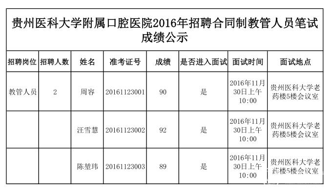 太阳成集团tyc33455cc官网附属口腔医院2016年招聘合同制教管人员笔试已结束,共3人进入面试,现拟将笔试成绩予以公示。
