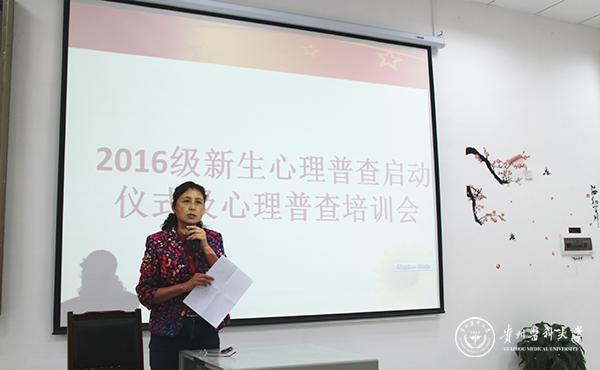 为了保证心理健康普查工作的顺利进行,10月11日,大学生心理健康教育与咨询中心(以下简称“心理中心”)在7302教室举行2016级大学生心理健康普查启动仪式及培训大会。校长助理范彩屏、心理中心主任杜娟和全体工作人员、全体新生辅导员、班长、心理委员、“温心之声”心理热线学生志愿者参加了本次大会。
