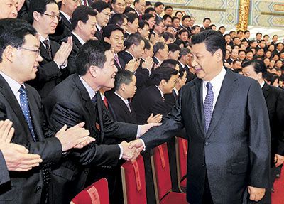 下午3时,习近平等来到人民大会堂金色大厅,同代表们亲切握手,并合影留念。
