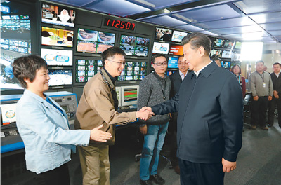 临近中午,习近平来到中央电视台。他听取中央电视台板块业务、媒体融合等情况介绍,到总控中心观看电视传播能力建设视频展示,在《新闻联播》演播室、导控室向主持人和工作人员了解新闻制作导播流程,并亲自切换按钮体验模拟播出。习近平指出,中央电视台每天面对数亿观众,一定要紧跟时代、放眼全球,多设计一些融思想性、艺术性于一体的好栏目,多创办一些脍炙人口、寓教于乐的好节目。
