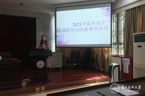 金晶做了面试技巧培训。内容包括:面试着装、基本礼仪、应试技巧等。金晶在讲着装时特地分为男、女同学两个方面,向在座同学详细的提出了许多基本礼仪和面试过程中应避免的雷区,在为同学们讲授应试技巧时也给同学们提了很多建议,如勿迟到、勿喧哗、轻敲门、先问好、再落座、懂礼貌,突发事件细心处理、专业领域体现素质等。会场气氛轻松活泼,同学们受益匪浅。
