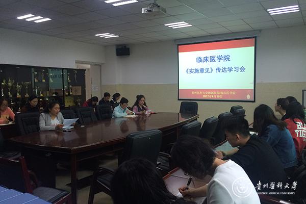 4月19日,临床医学院在北京路校区基础一号楼四楼会议室召开了《中共贵州省委关于深化人才发展体制机制改革推进守底线走新路奔小康的实施意见》传达学习会。会议由临床医学院党委书记周红主持,临床医学院副院长戚璐及各职能部门工作人员、各年级辅导员参加。