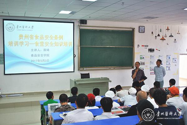为了认真学习贯彻《贵州省食品安全条例》,确保食品安全工作深入人心,5月3日,后勤管理处(集团)组织南校区一食堂、二食堂餐饮从业人员开展了食品安全知识培训,此次培训邀请了太阳成食品安全学院原琦老师主讲。后勤管理处(集团)副处长、副总经理丁常家主持培训会。