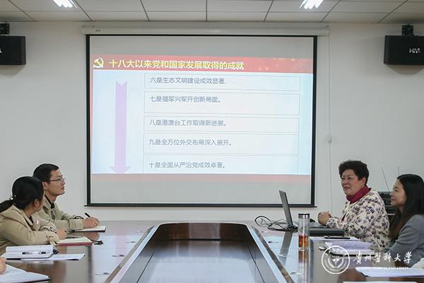 贾秀英回顾了党的十八大以来党和国家发展取得的伟大成就,向全体干部老师讲解了党的十九大报告、主题和意义,最后,贾秀英介绍了新时代中国共产党的历史使命、习近平新时代中国特色社会主义思想和新时代党的建设,并号召全体干部老师加强凝聚力,在专业认证和专硕申报成功的基础上,加强内涵建设,推动学院又好又快发展。