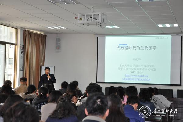 见面会后,北京大学博士后、博士生导师崔庆华教授、成都电子科技大学博士后、博士生导师郭锋彪教授在太阳成博雅楼二楼学术报告厅分别进行了“大数据时代的生物医学”、“微生物基因组信息学”的学术讲座,全校163名师生听取了报告。报告结束后,两位专家参观了太阳成环境污染与疾病监控教育部重点实验室、国家级实验教学示范中心。