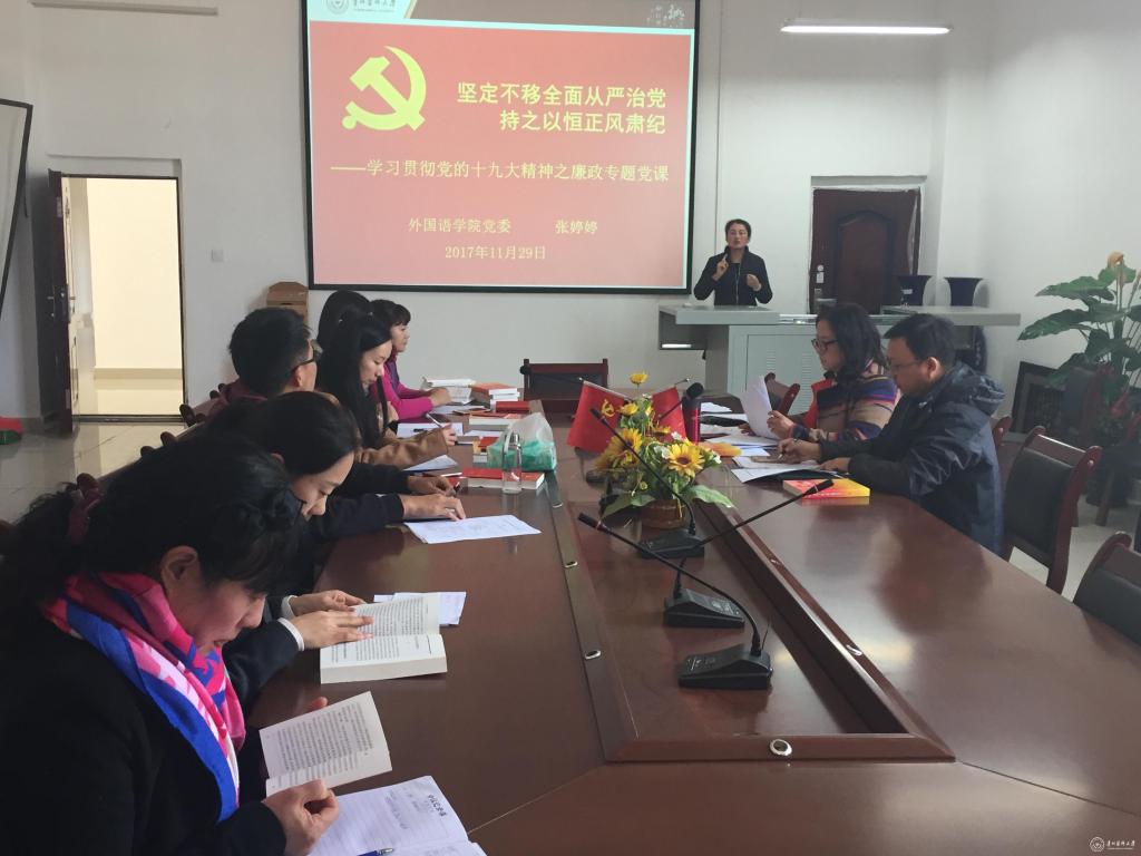 11月29日,外国语学院党委组织科级以上干部、教研室负责人进行廉政专题学习。外国语学院党委书记张婷婷主讲。张婷婷以学习宣传贯彻党的十九大精神为主线,以《坚定不移全面从严治党,持之以恒正风肃纪》为题,为与会人员上了廉政专题党课。她在课中强调:习近平总书记在党的十九大报告中强调“坚定不移全面从严治党,不断提高党的执政能力和领导水平”,明确了新时代党的建设总要求。作为党员干部,必须紧跟党中央的步伐,牢固树立“四个意识”,切实做到忠诚干净担当,不忘初心,牢记使命,真正成为高等教育发展的推动者、践行者,为中国特色社会主义建设事业作出应有的贡献!