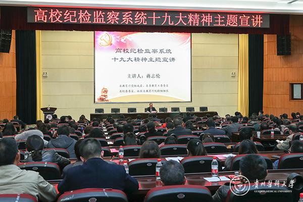 省纪委委员、省纪委派驻省教育厅纪检组组长蒋志伦结合教育系统党风廉政建设和反腐败工作,从四个方面为大家解读了十九大报告和习近平总书记在贵州省代表团重要讲话精神。一是党的十九大报告和习近平总书记在贵州代表团重要讲话精神的重大意义;二是学深悟透党的十九大的主要精神;三是深刻领会中国特色社会主义进入新时代,贵州教育更多一份骄傲和自豪,更添一份责任和担当;四是坚定不移推进全面从严治党,为续写新时代贵州发展新篇章提供坚强保障。