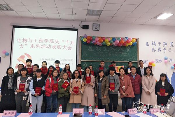 党的十九大召开以来,生物与工程学院党委迅速行动,持续掀起了学习宣传贯彻落实党的十九大精神热潮。为表彰在学习宣传贯彻落实党的十九大精神系列活动中涌现出的先进集体和优秀个人,12月11日晚生物与工程学院在南校区1101教室举行表彰大会。生物与工程学院党委书记封韬、副院长刘红美、副书记姚琨,院综合办公室,学生科,2017级辅导员出席。学院170余名学生代表参加。