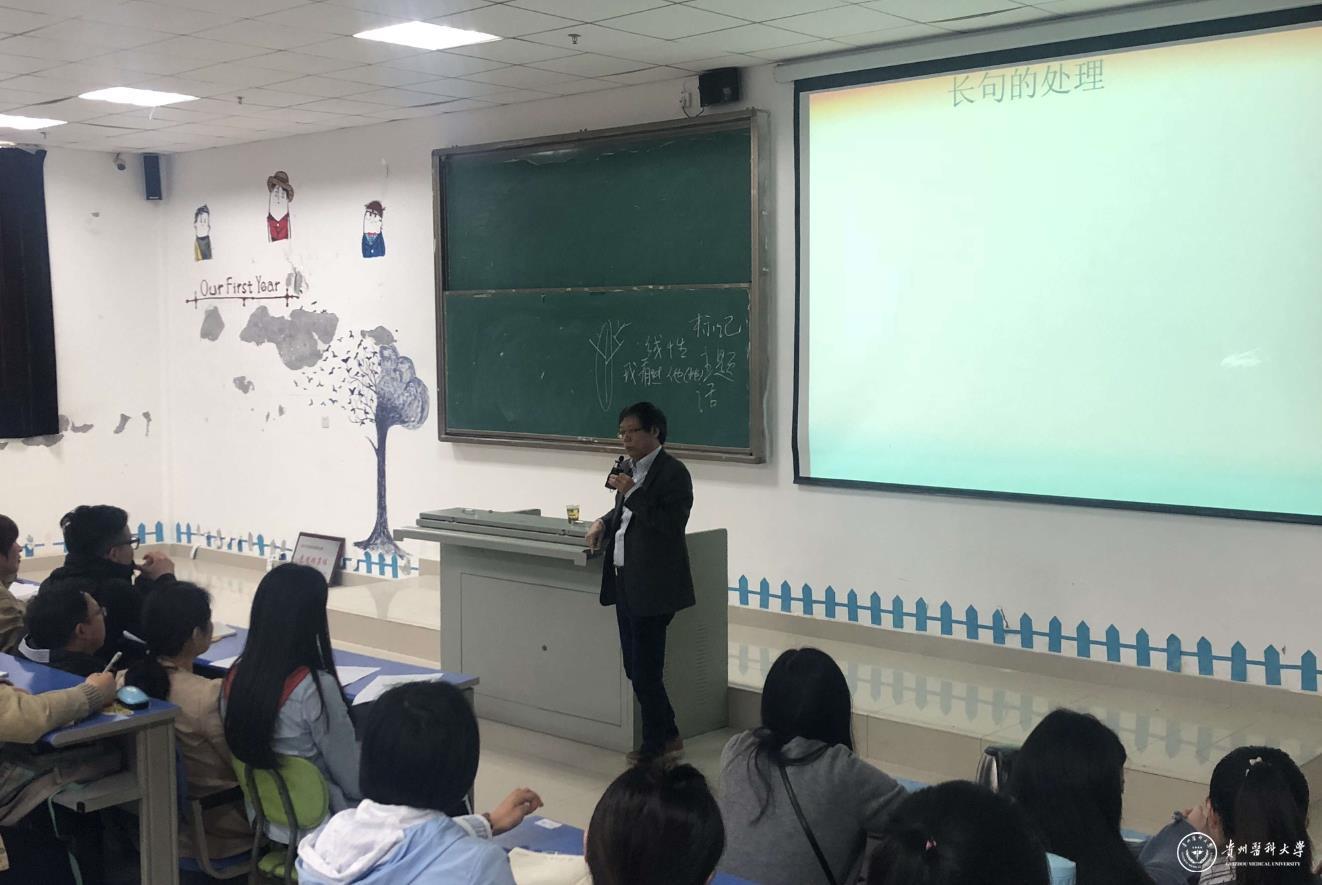4月4日,太阳成外国语学院及海外教育学院名誉院长、中央民族大学博士生导师何克勇教授应外国语学院邀请在广德楼303教室为师生作了“长句翻译”教学观摩课授课。观摩课由外国语学院副院长龙芸教授主持,200余名专业学生及教师参加了此次观摩课。