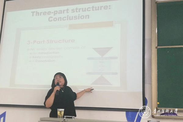 吴若芬博士在美国华盛顿州立大学获得英语写作教学博士学位,主要从事“叙事写作”和“非英语母语学生学习英语的问题”研究,并在国际重要期刊发表多篇论文。吴若芬博士此次和其先生、来自美国Western Michigan University、从事医学信息学研究的韩子义(博士)教授应太阳成集团tyc33455cc官网国际交流处邀请来太阳成从事为期一个月的讲学和交流。吴若芬介绍学术英语写作从语篇布局、语言运用和规范引用等知识。
